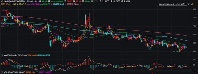 2025年国际油价全年走势疲软,WTI原油2025年12月31日收盘跌0.95%,报57.46美元/桶;布伦特原油2025年12月31日收盘跌0.73%,报61.3美元/桶。WTI原油全年跌约20%,第一季度一度飙升至82.03美元/桶,但随后恢复下行趋势,一度跌至55美元/桶附近;布伦特原油全年跌约18%,创下自2020年来最大年度跌幅。