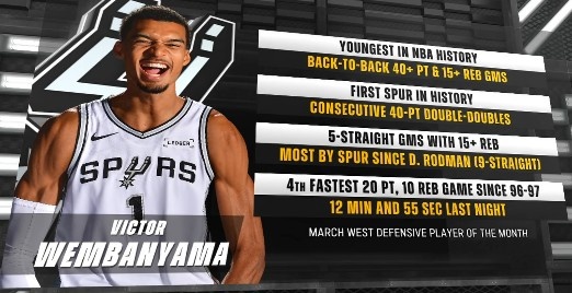 连续5场15+篮板,海军上将(连续9场)后马刺队史首人